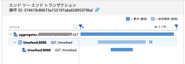 今回の内容とは関係ありませんが、Application InsightsのJavaAgentも前回のDaprサンプル同様導入していますので、分散トレーシングも確認することができます。 残念ながらContourのDistributed Tracing対応についてはまだ確認できていませんので設定できていません。 したがってトレーシングの起点はAggregatorアプリケーションからとなっています。