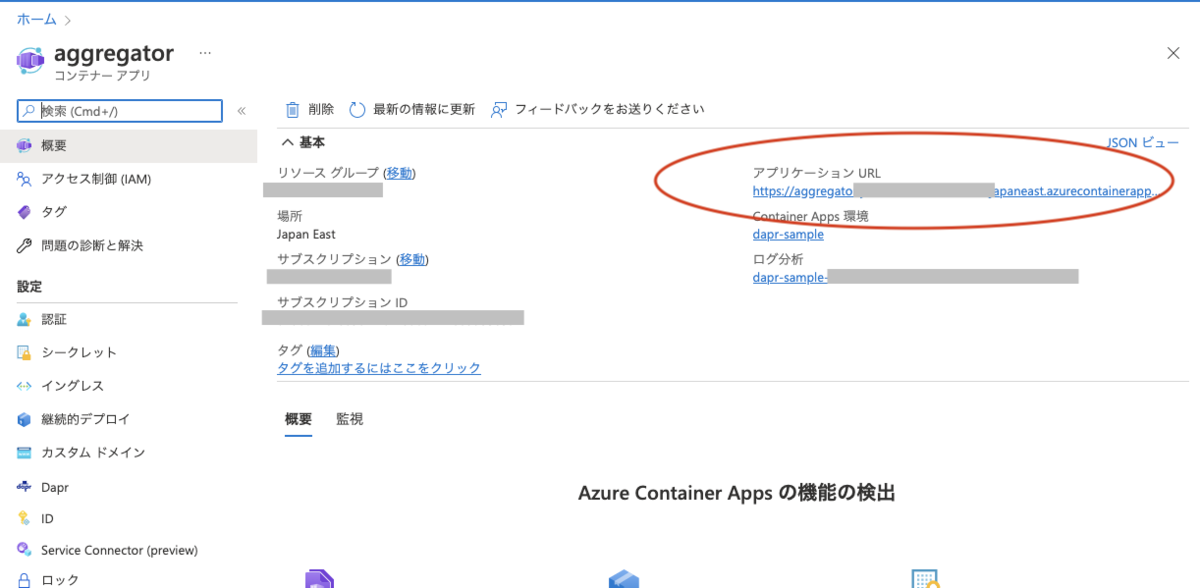Azureポータルの「コンテナアプリ」からAggregatorを選択して、右側に表示されている「アプリケーションURL」がExternal Ingressで公開されているURLです。こちらをコピーしてアクセスすればテスト可能です。