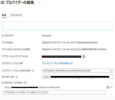 App Service/Functions の認証ブレードから IDプロバイダーに「Microsoft」を選択して設定を行います。