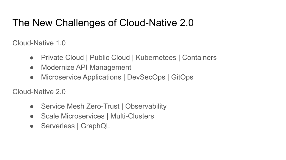今積極的に行われているのは、ApplicationのModernize(Microservice Application)、Kubernetes・コンテナ技術の活用といったものではないでしょうか。 これは「Cloud-Native 1.0」の世界観です。KubeConに集まってくるSoloのような企業・技術者はすでにその先を目指している。それが「Cloud-Native 2.0」です。