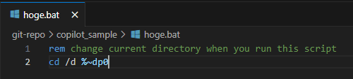 これもよく忘れてググって書くやつでした、バッチファイル実行時に、バッチファイルの場所にカレントディレクトリを変更するやつ。さくっとサジェストしてくれました。