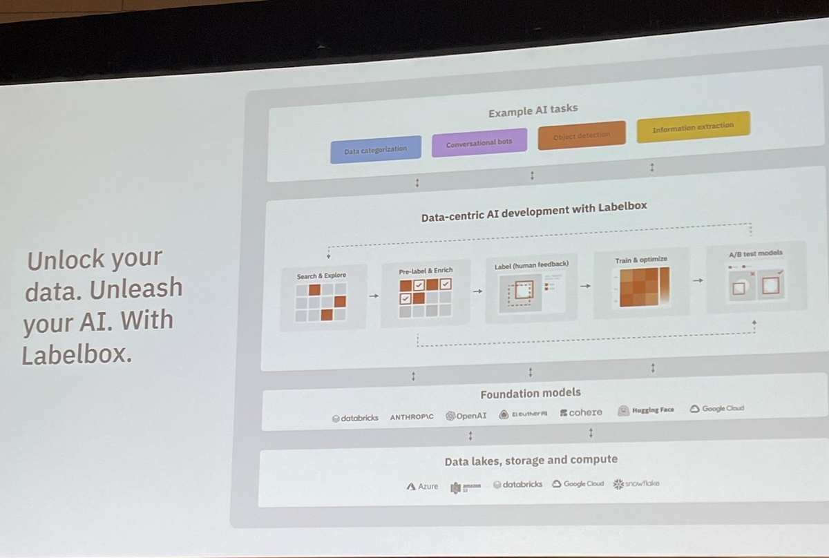 Based on reports from members participating in the local Data + AI SUMMIT 2023 (DAIS), the exponential progress of AI and computing and the emergence of basic models were presented in the title "Labelbox | Unlocking Enterprise AI with Your Proprietary Data and Foundation Models". This session aims to share fast, cost-effective and automated methods of how AI systems are built and applied to data. The target audience is people who are interested in AI technology, people involved in data analysis and building AI systems, and corporate decision makers.