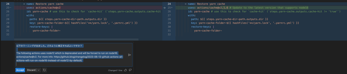 このように、GitHub Actionsで発生するワーニングなどは、GitHub Copilot Chatに問い合わせすることで、対応方法はだいたい提示してくれそうです。