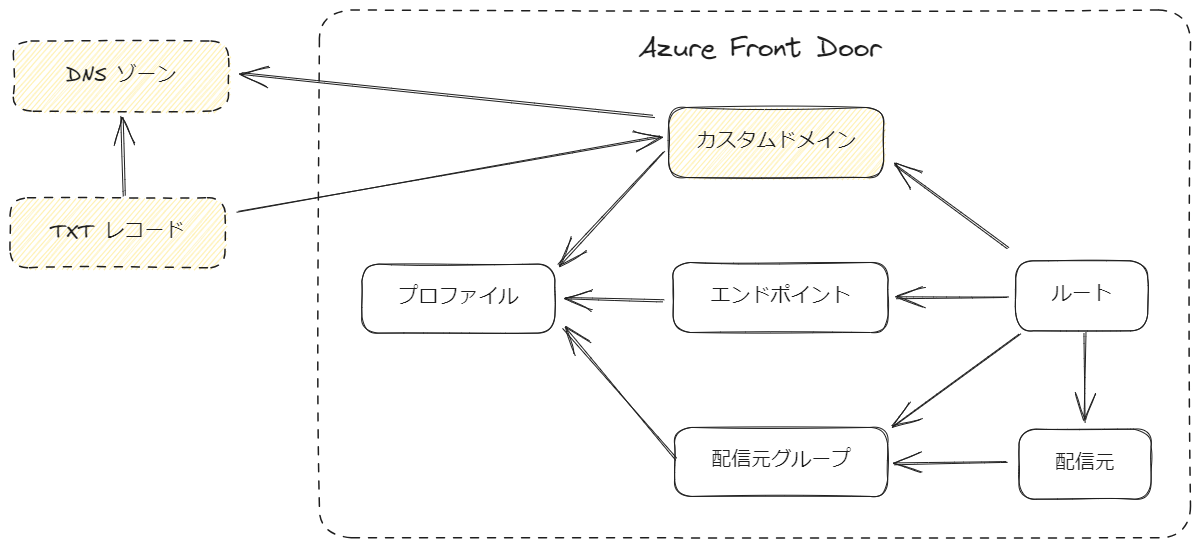 しかし、App Service 証明書の利用時には注意点がありますので後述します。 あとは TLS の最小バージョンとして「TLS 1.0」or「TLS 1.2」という選択があるのですが、そのままの意味ですので説明は割愛します。 文章が多くなってしまったので、そろそろ Terraform のコードを見ながら Azure Front Door のカスタムドメインを説明していきましょう。 今回は新たに AFD マネージド証明書を選択した場合、Terraform の各リソースは以下のような関係性になります。