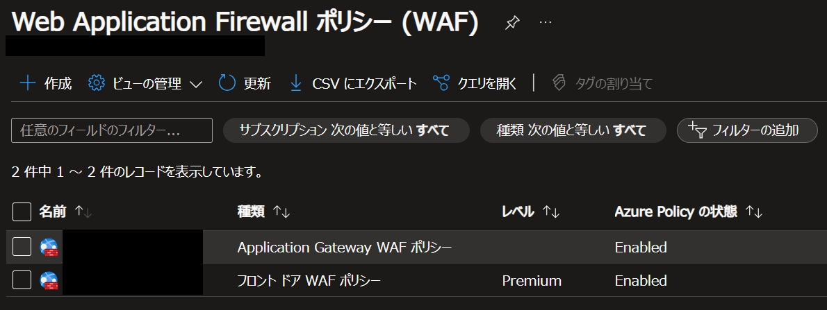 また、Azure Portal で WAF ポリシーの一覧を表示しても Azure Front Door / Application Gateway 両方の WAF ポリシーが表示されます。