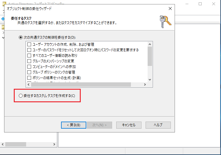 委任するタスク の項目で 委任するカスタムタスクを作成する を選択します。