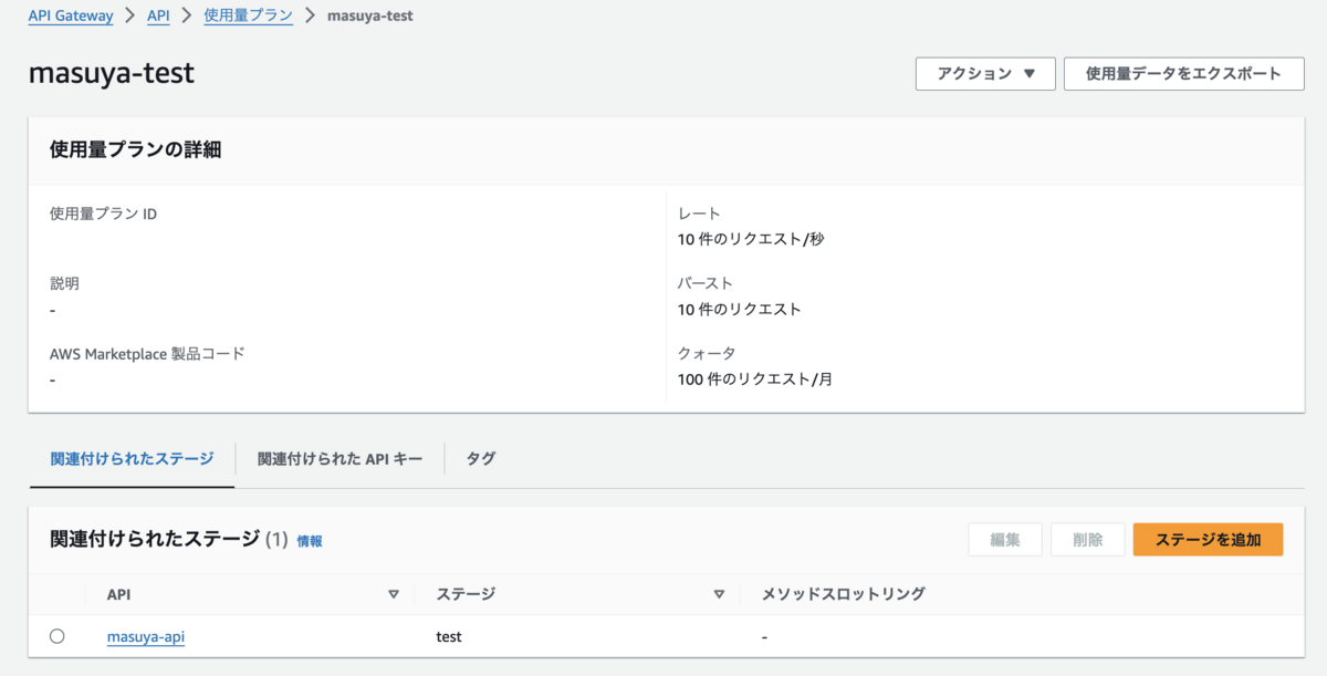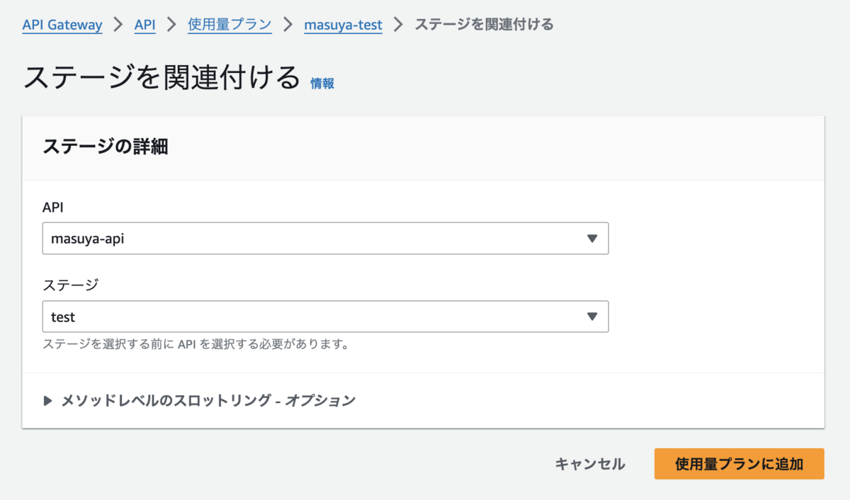 使用量プランとAPIのステージを紐付けます。