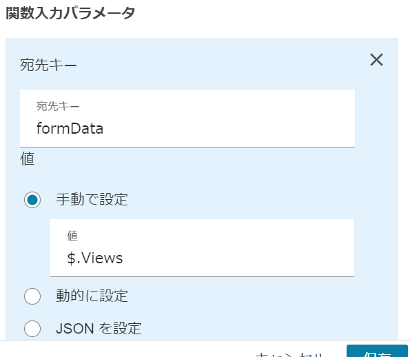 フロー「AWS Lambda関数を呼び出す」ブロックの「関数入力パラメータ」 設定