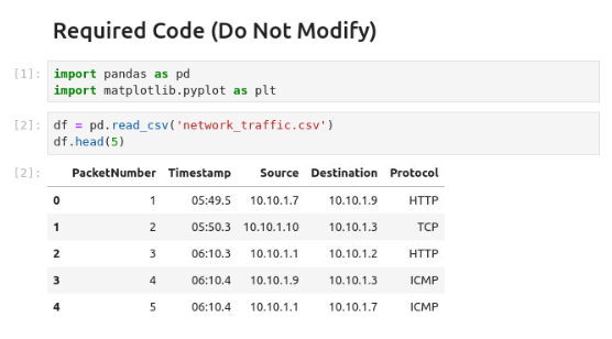 次に[2]を実行します。ログファイル('network_traffic.csv')を読み込み最初の5行を表示します。