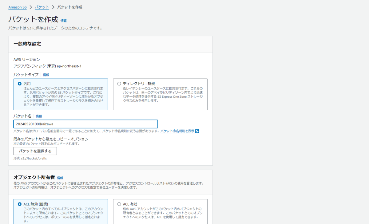 AWSコンソールからS3を検索し、バケットを作成します。特に変更する箇所はなく、デフォルト設定のまま作成します。