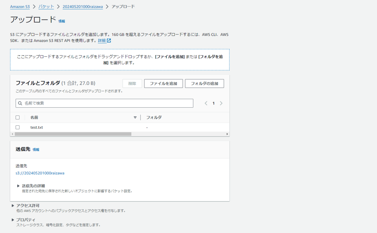 サンプルのtxtファイルを作って試しにS3バケットに保存してみます。ドラックアンドドロップでアップロード出来ました。
