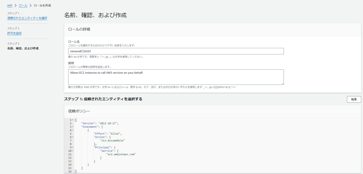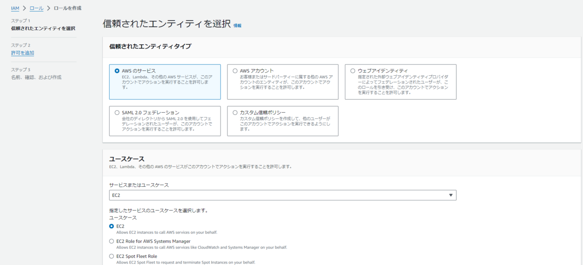 信頼されたエンティティタイプは「AWSのサービス」、ユースケースは「EC2」を選びます。