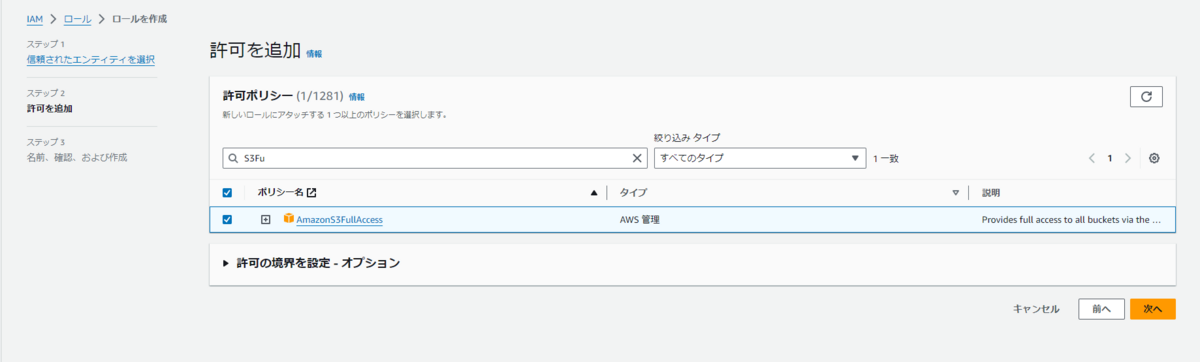 ポリシーは「AmazonS3FullAccess」を選択します。