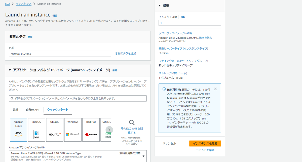 コンソールからEC2サービスに移動し、「インスタンスを起動」で新しいEC2インスタンスを作成します。AMIはAmazon Linux 2を選択しました。