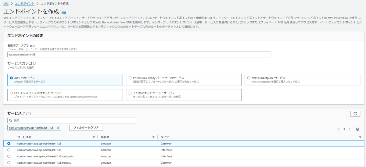 エンドポイントを作成します。名前を入力し、「AWSのサービス」、「インスタンスのVPCのリージョン.s3(Gatewayタイプ)」を選択します。