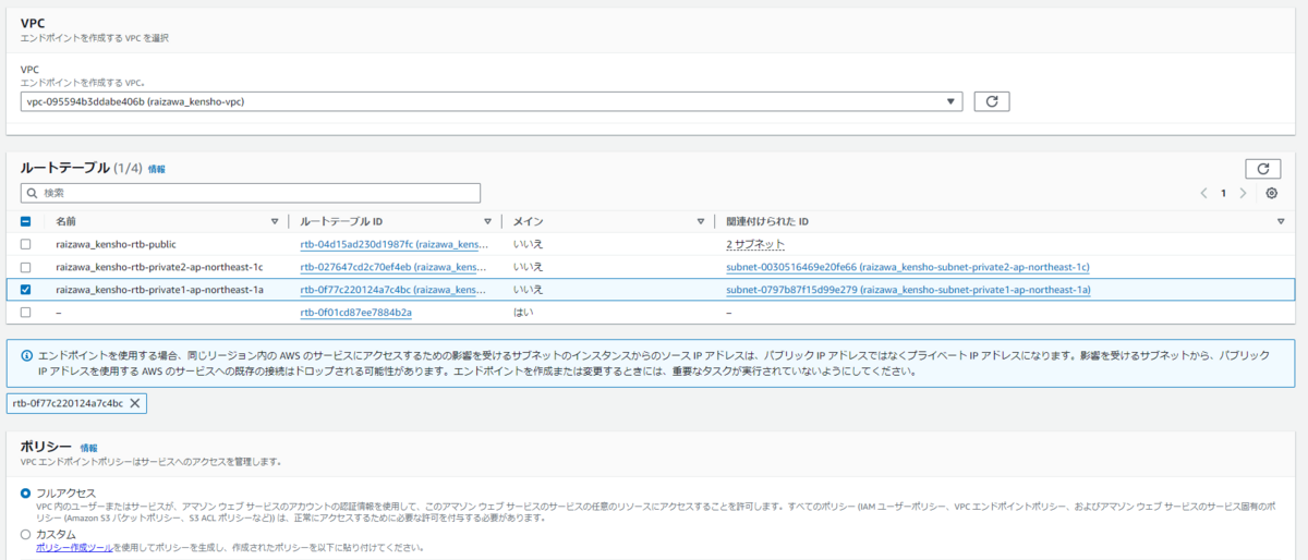 続いて自分のVPCを選択、紐づけるルートテーブルを選択します。このルートテーブルは作成したプライベートEC2インスタンスのルートテーブルです。