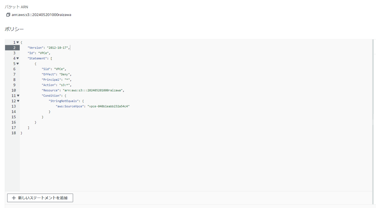 このポリシーでは、作成したゲートウェイ以外からの接続をすべて拒否します。コンソールでのバケット操作も出来なくなります。