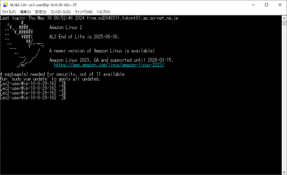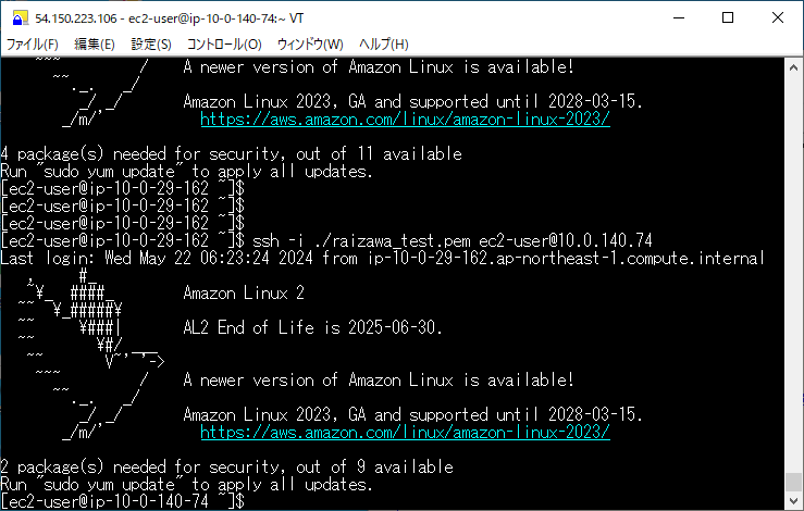 ssh -i [キーのフルパス] ec2-user@[プライベートIP]