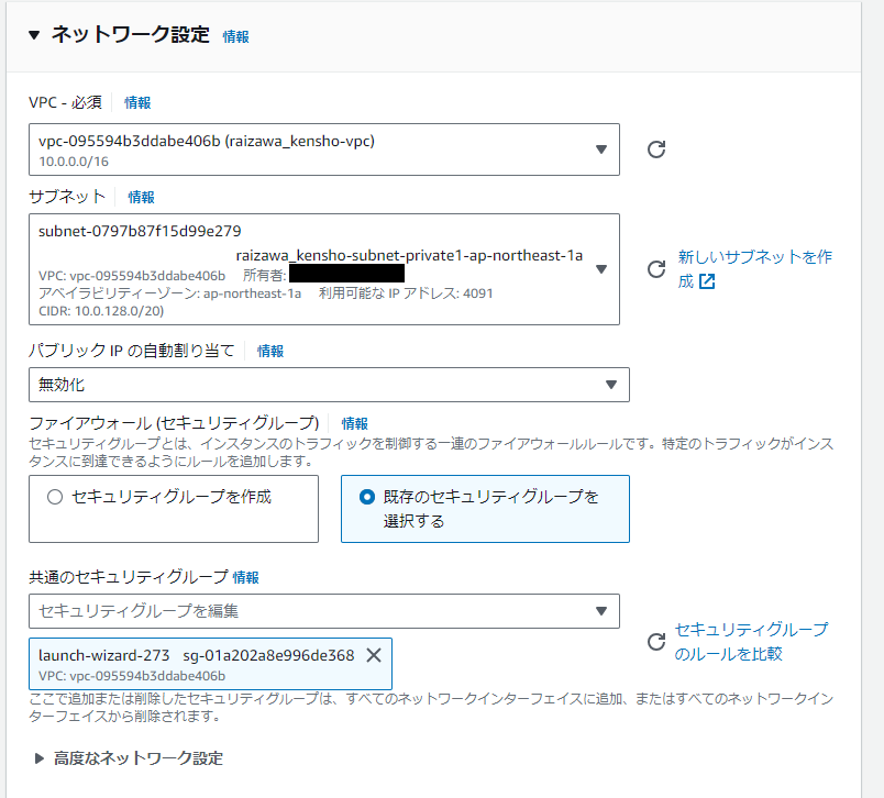 ネットワーク設定です。プライベートサブネットを選びましょう。