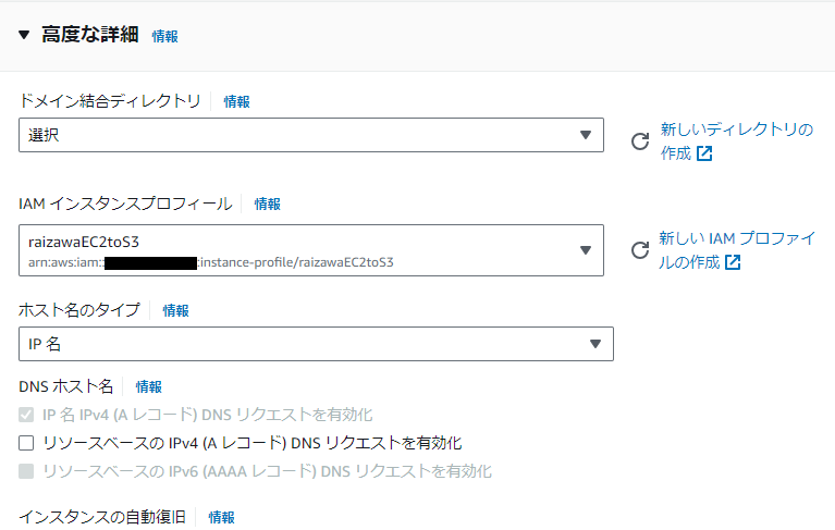 高度な詳細を展開し、IAMインスタンスプロフィールに作成したIAMロールを選びます。