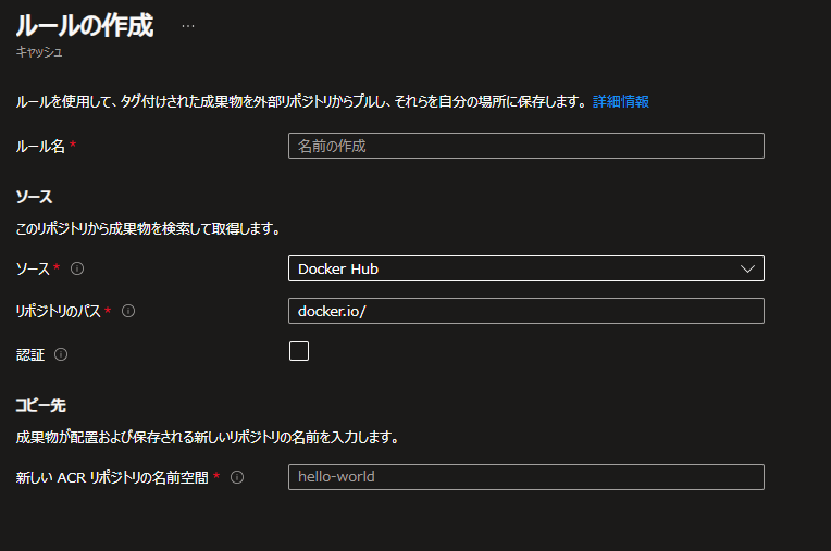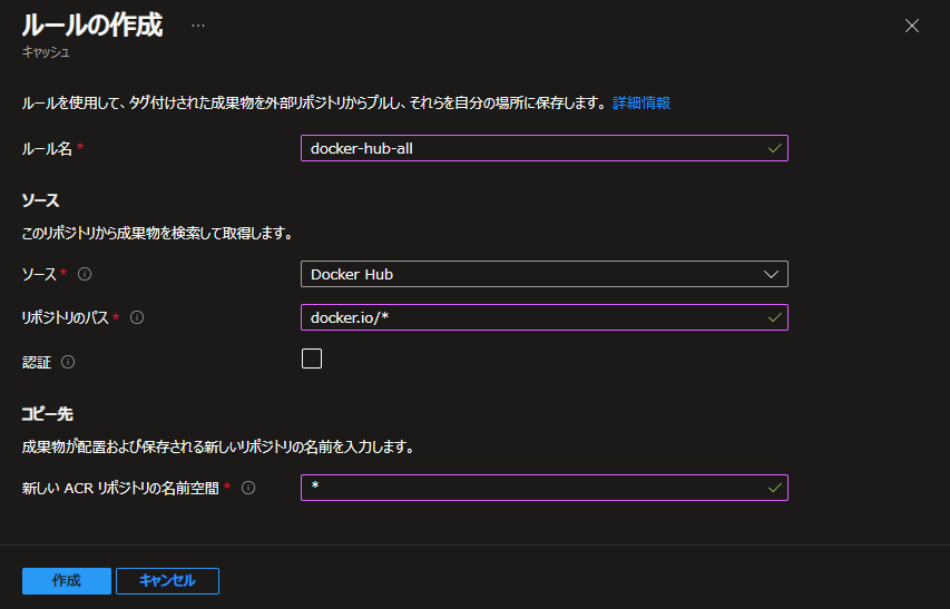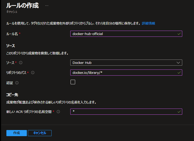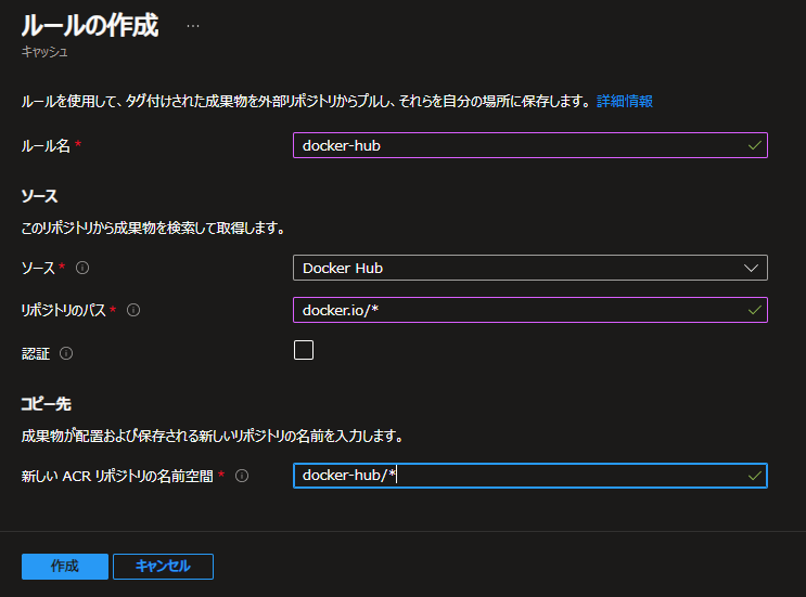 参照先リポジトリのパスを docker.io/* 、マッピングするACR内の名前空間を * としました。