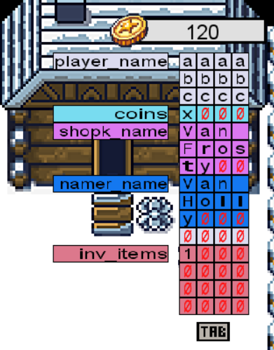 そのためにすぐ上の変数player_nameをあふれさせる(オーバーフローさせる)ことができるか試してみましょう。 player_nameは12バイトなのでVan Hollyと会話して13バイト「aaaabbbbccccx」を渡してみましょう。