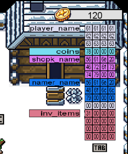 TABキーを繰り返し押すとASCIIビューとHEXビューに切り替えることができます。 HEXビューでコインの数を表す変数coinsの値を見ると10 00 00 00になっています。 この値を変えることができたら所持するコインの数を増やせそうです。