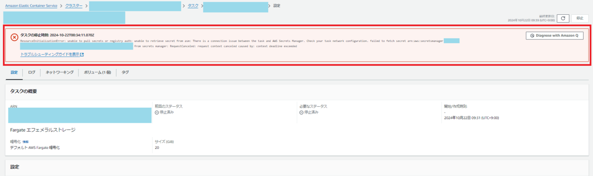 今回は、タスクとAWS Secrets Manager間の接続に問題があり、Secretsを取得できなかったことが原因と分かりました。