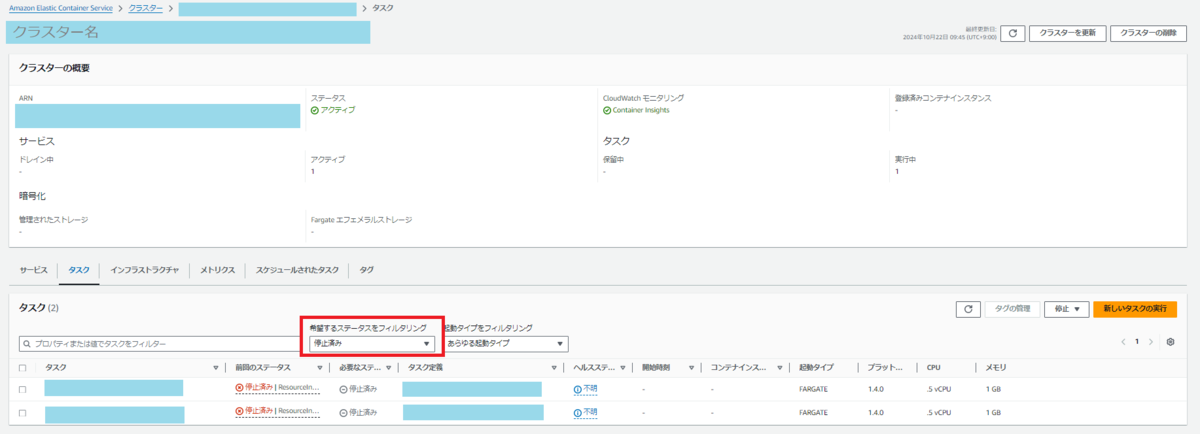 クラスターの「タスク」タブで、「希望するステータスをフィルタリング」プルダウンにて「停止済み」を選択すると、停止されたタスクを確認できます。