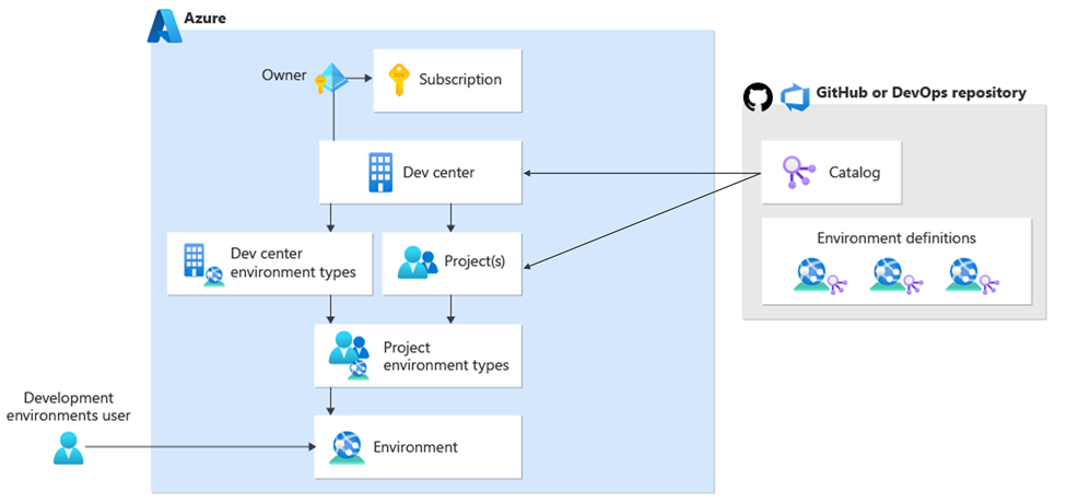 Azure Deployment Environmentsは複数のAzureリソースの組み合わせで構成されています。 公式ドキュメント にある下図を見てもわかるように、Dev CenterやProject、Catalogなど、多様なリソースが組み合わさっています。