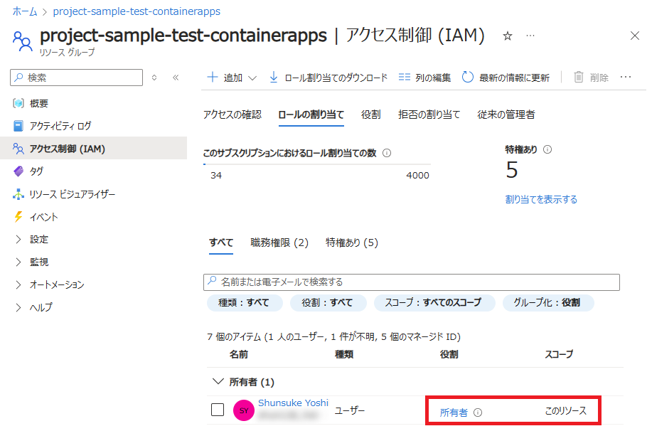 リソースグループのIAMを見ると、Azure Deployment Environmentsからリソースを作成したユーザーが、リソースグループの所有者として登録されていることが確認できます。