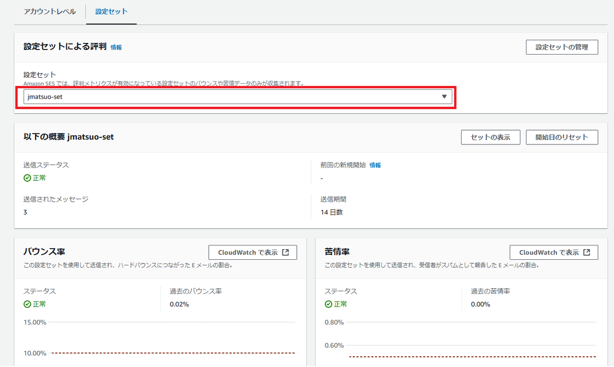 例えば東京リージョンで1つのIDからのみ、メールを送信している場合は、設定セットを使うメリットは無いかもしれませんが、複数のIDを使って一部のIDは専用IPを使っている、ような状況ではメトリクスを別に取得することは運用上必要な条件になってくると思います。(送信元IPが異なる場合評判メトリクスも別として考慮する必要があるため)