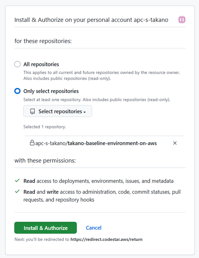 2-6. [Install & Authorize AWS Connector for GitHub] の画面で、自身のリポジトリを選択し、[Install & Authorize] をクリックします。この後画面がマネジメントコンソールに戻ります。