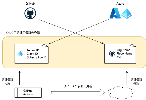 OIDC Connectionを利用するとパスワードなど秘匿情報を登録する必要もなく、安全性の高い方式です。 パスワードの代わりにGitHubとAzureの双方にそれぞれの情報を登録しておくことが必要です。
