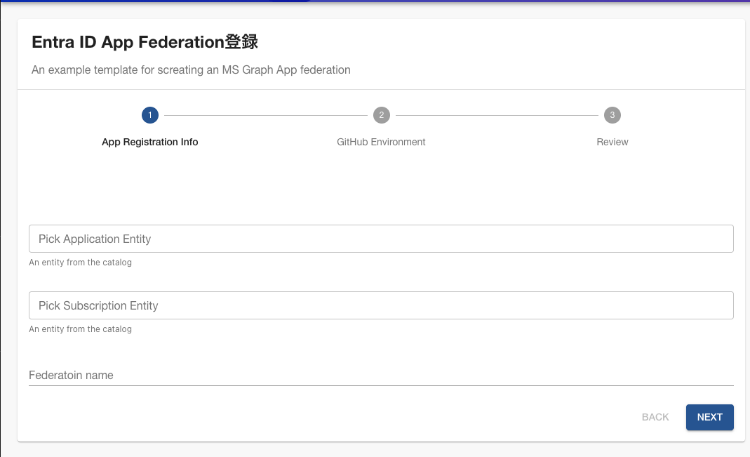 テンプレートを作成するにあたって、入力作業をより簡略化できるようにするため、AzureサブスクリプションやAzure Entra ID Application登録を(Client ID等必要となる情報とともに)Backstage のResource Catalogとして登録することにしました。これによるテンプレートを実行する際にAzureのテナントIDなどをユーザーが入力しなくても済むようにしています。