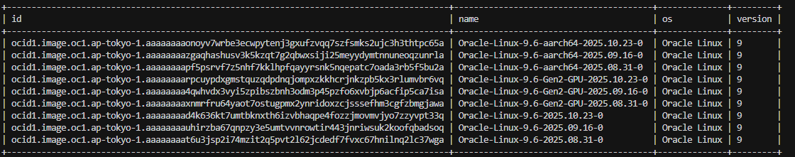 oci compute image list --compartment-id <コンパートメントのOCID> --lifecycle-state AVAILABLE --query "data[*].{name:\"display-name\", os:\"operating-system\", version:\"operating-system-version\", id:id}" --output table --operating-system "Oracle Linux" --operating-system-version "9"
